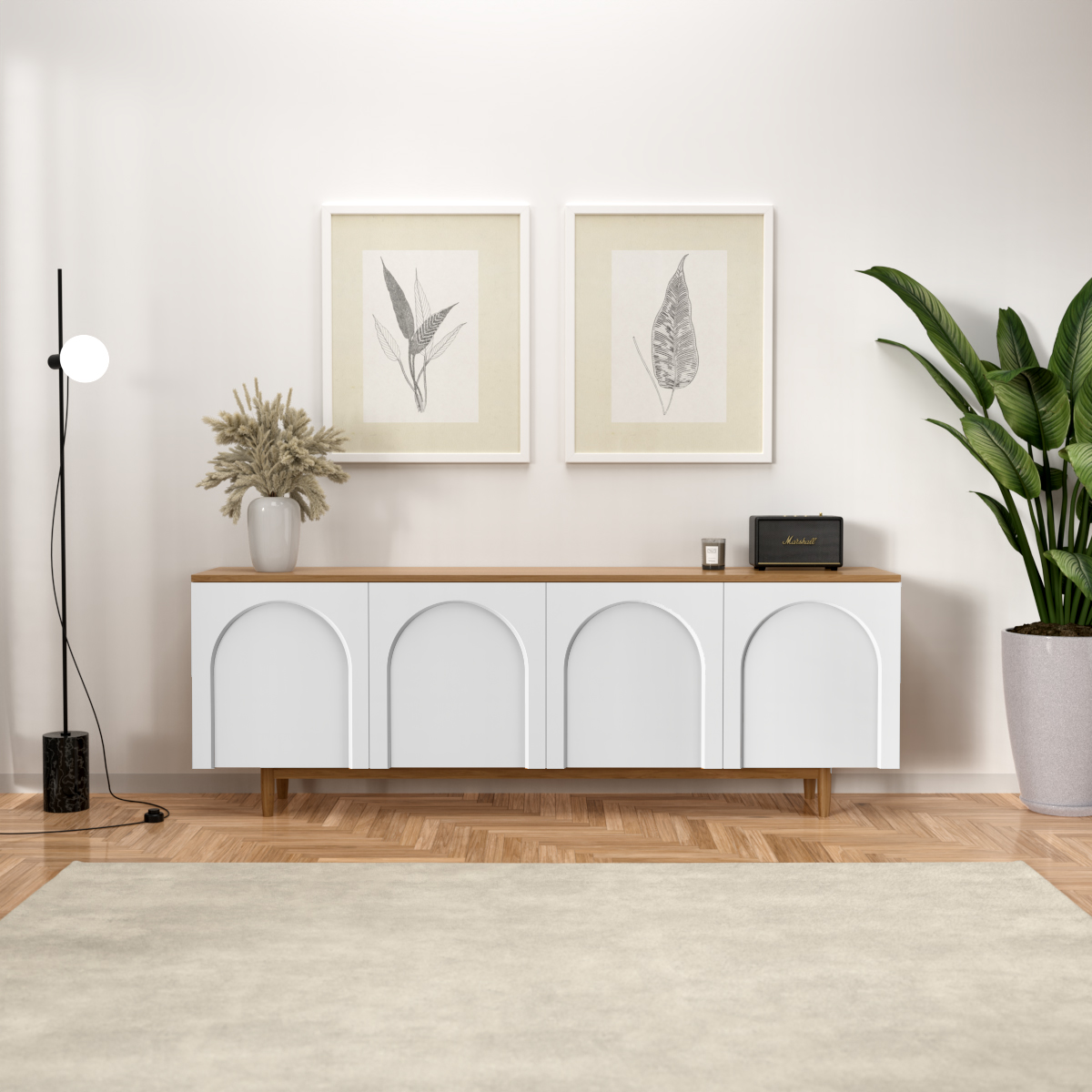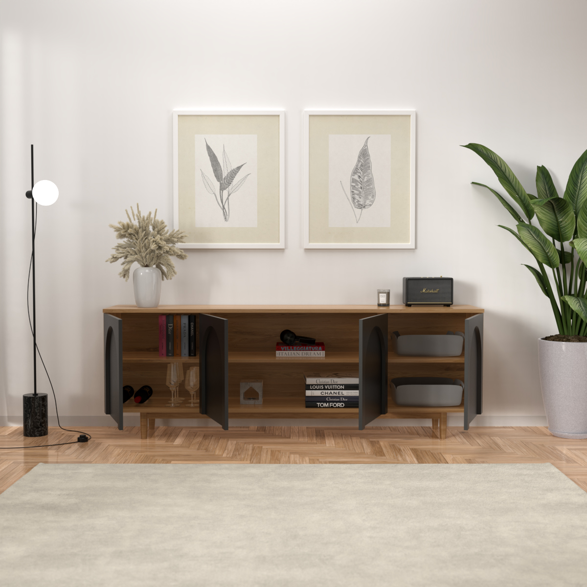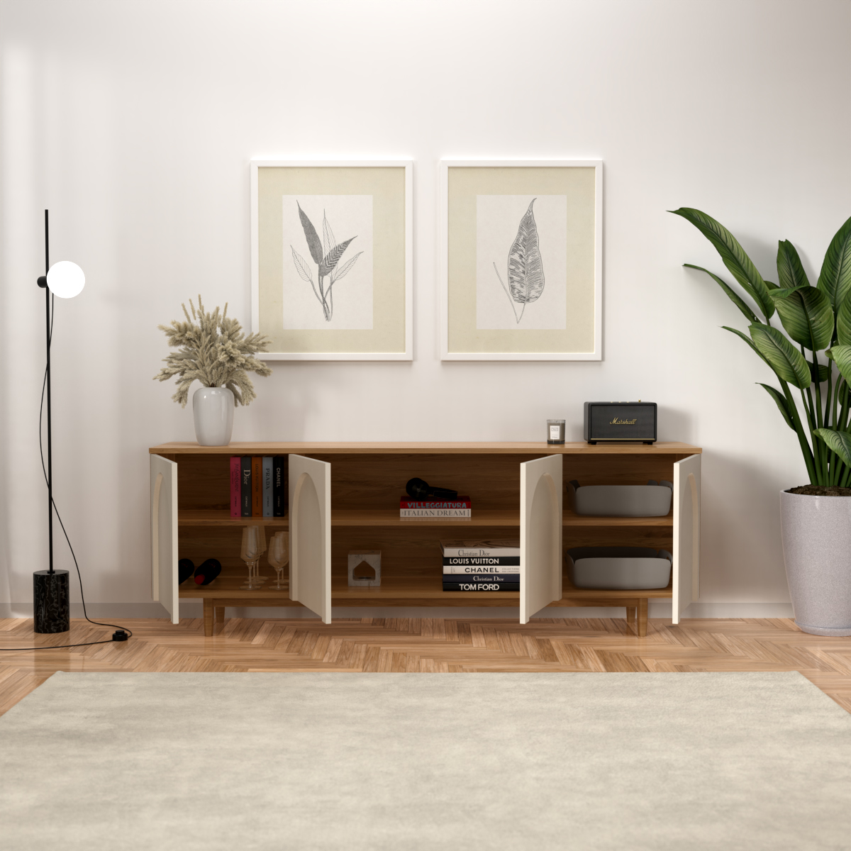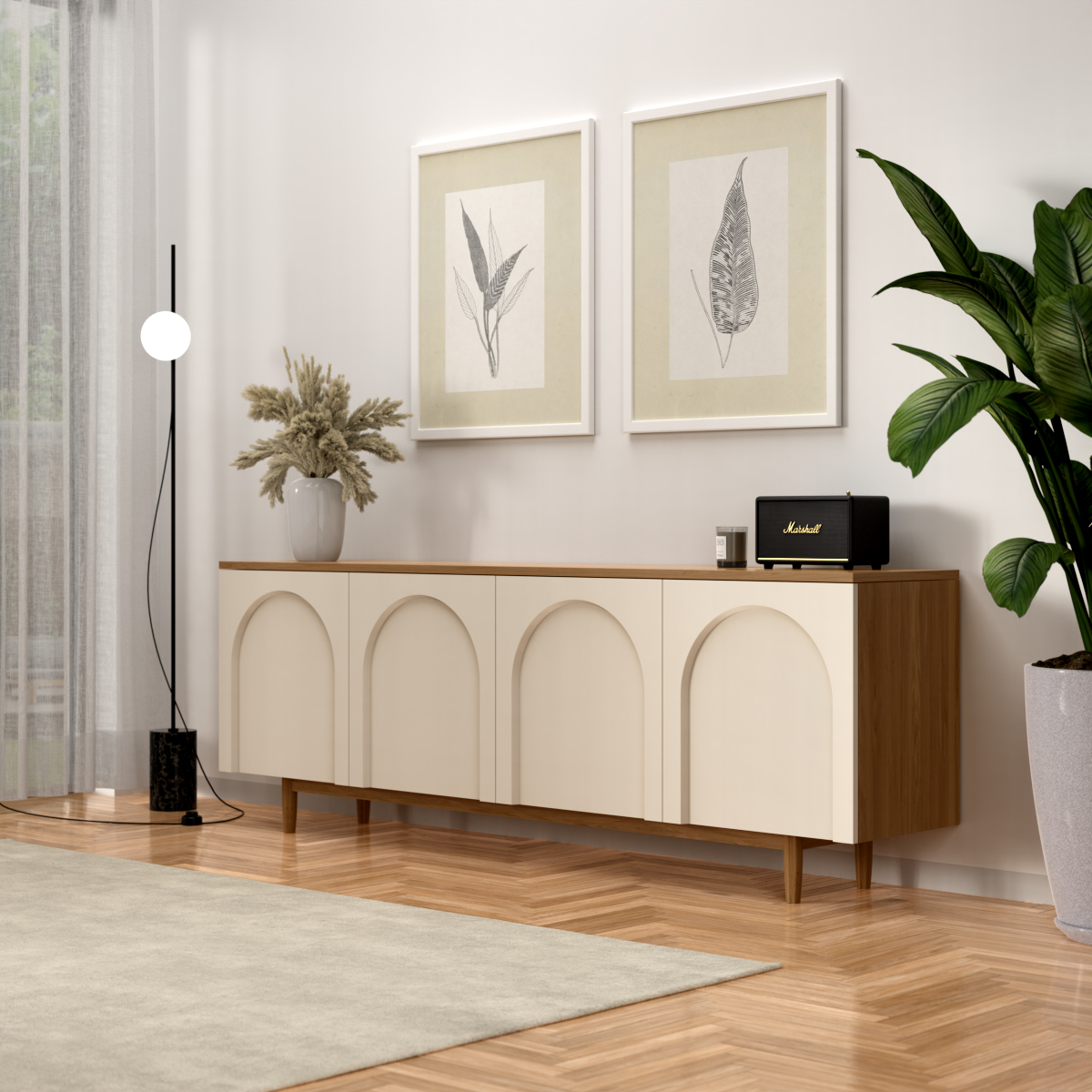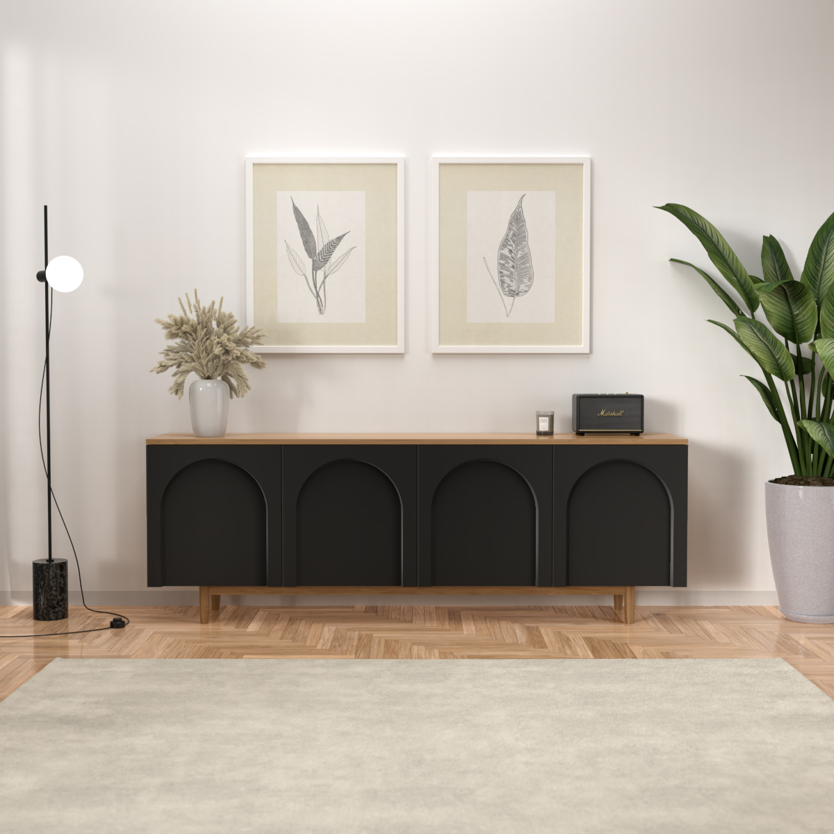 מזנון נורדי עם חיתוכי קשתות מוסיף עומק ואופי לחלל. הוא מציע אחסון פרקטי ומרווח לכל צרכי האחסון שלכם עם דלתות הנפתחות בטאץ (לחיצה). המזנון מגיע עם טקסטורת קשתות מהפנטת בחיתוכי CNC נותן טאץ’ של יוקרה, עם מסגרת עץ אלון טבעי והרגלים מעץ אלון מלא מעניקים את האופי הנורדי המיוחד. המזנון ישדרג וייעצב את חלל הסלון שלכם בצורה המושלמת ביותר.