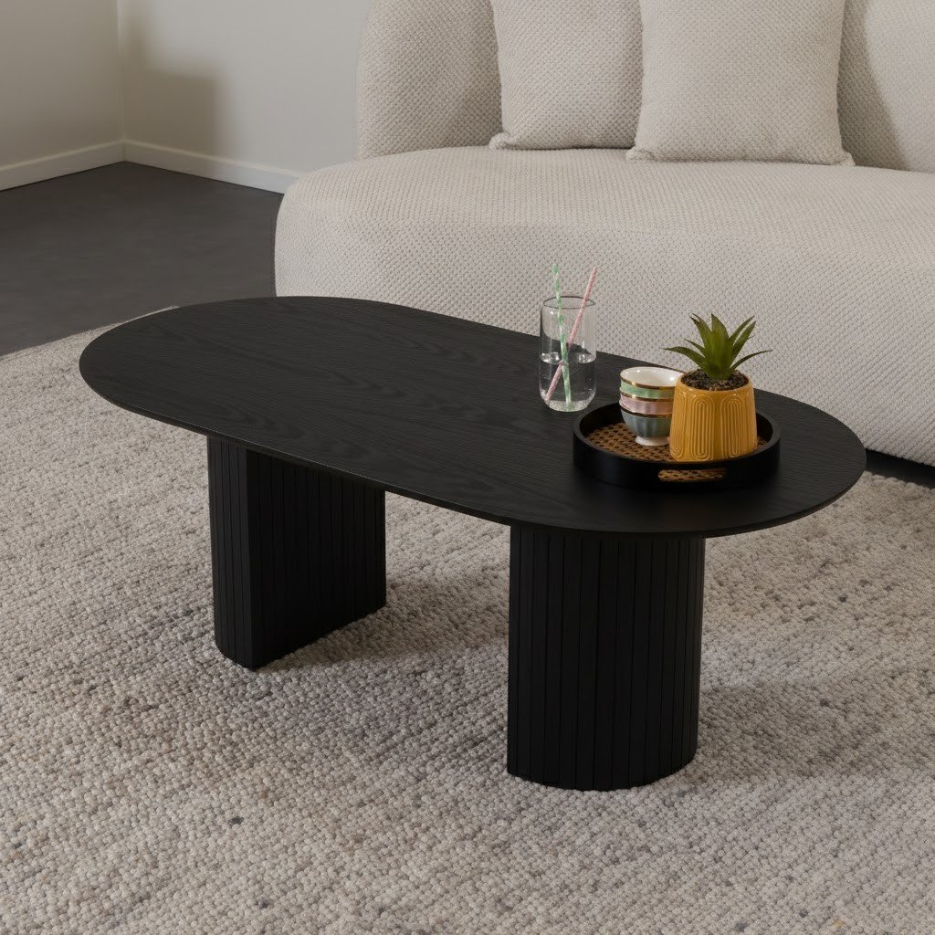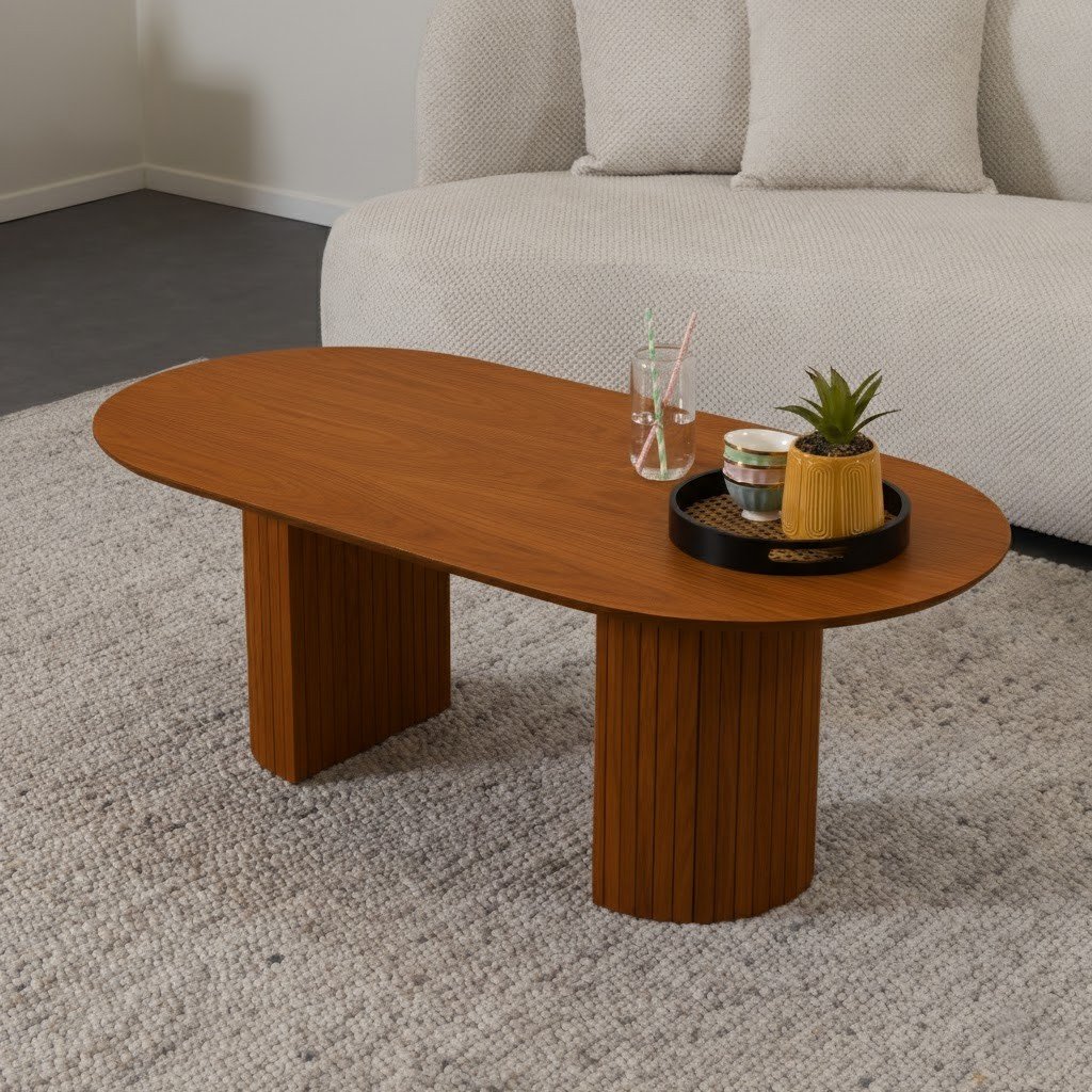 שולחן סלון אובלי בגוון אלון טבעי דגם LAPORT בווייב סקנדינבי מודרני. השולחן סלון עשוי עץ תעשייתי בחיפוי פורניר עץ אלון בגוון טבעי.
