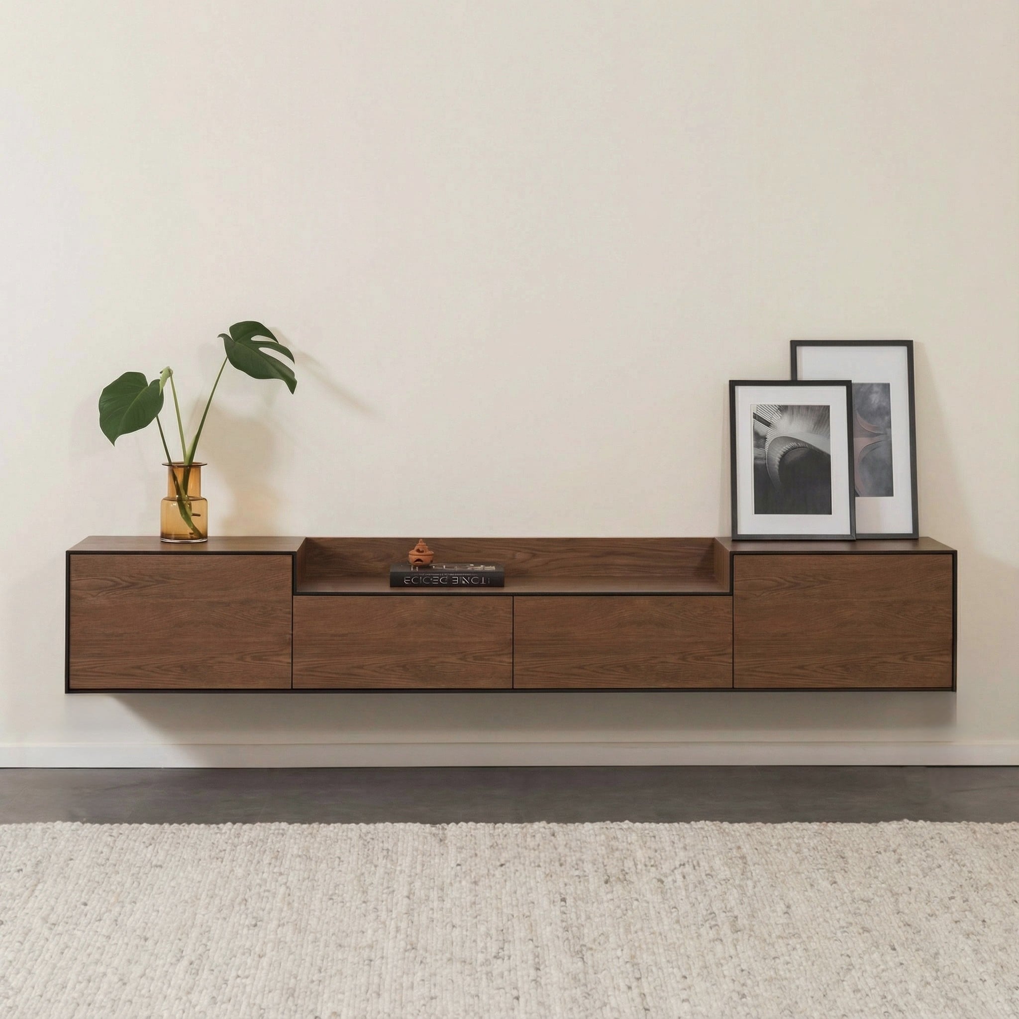 קבלו את הפיס ההורס שהולך להפנט את כל מי שישב בסלון שלכם! מזנון תלוי לסלון מודרני דגם MENDY בגוון פורניר אלון טבעי / אגוז עם מסגרת שחורה בחזית. באמצע המזון ישנו מדף עליון פתוח שמייצר אפקט מאוד חדשני במזנון ואין ספק שמשדרג את כל העיצוב כולו. מזנון צף “מנדי” מגיע עם 2 דלתות בצדדים, ו2 קלפות באמצע הנפתחות בטאץ (לחיצה).