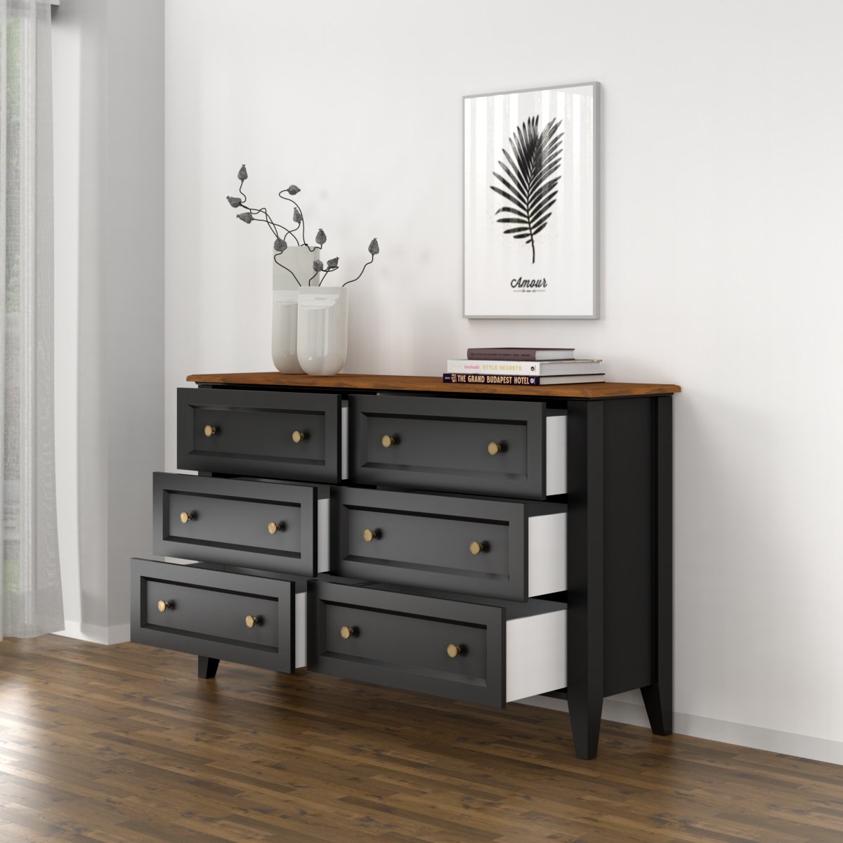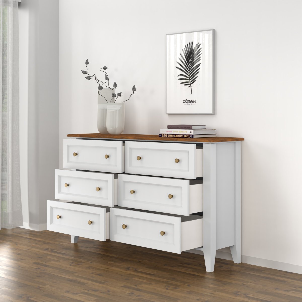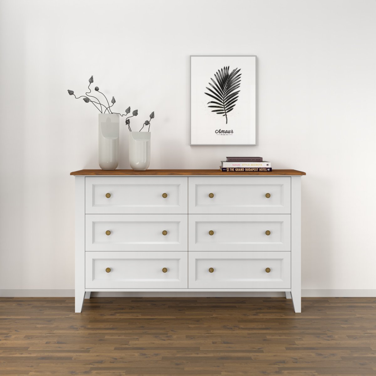 אל תופתעו אם תרצו להחליף את כל העיצוב בבית בהתאם לקומודה היסטרית הזו! שידה כפרית דגם SORLOT עשויה מעץ תעשייתי צבוע בתנור אשר משרה אווירה חמה וכפרית. השידה מגיעה עם 6 מגירות אחסון פונקציונליות עם ידיות נחושת עם טריקה שקטה. ומעל כל היופי הזה יש פלטה עץ בגוון אגוז.